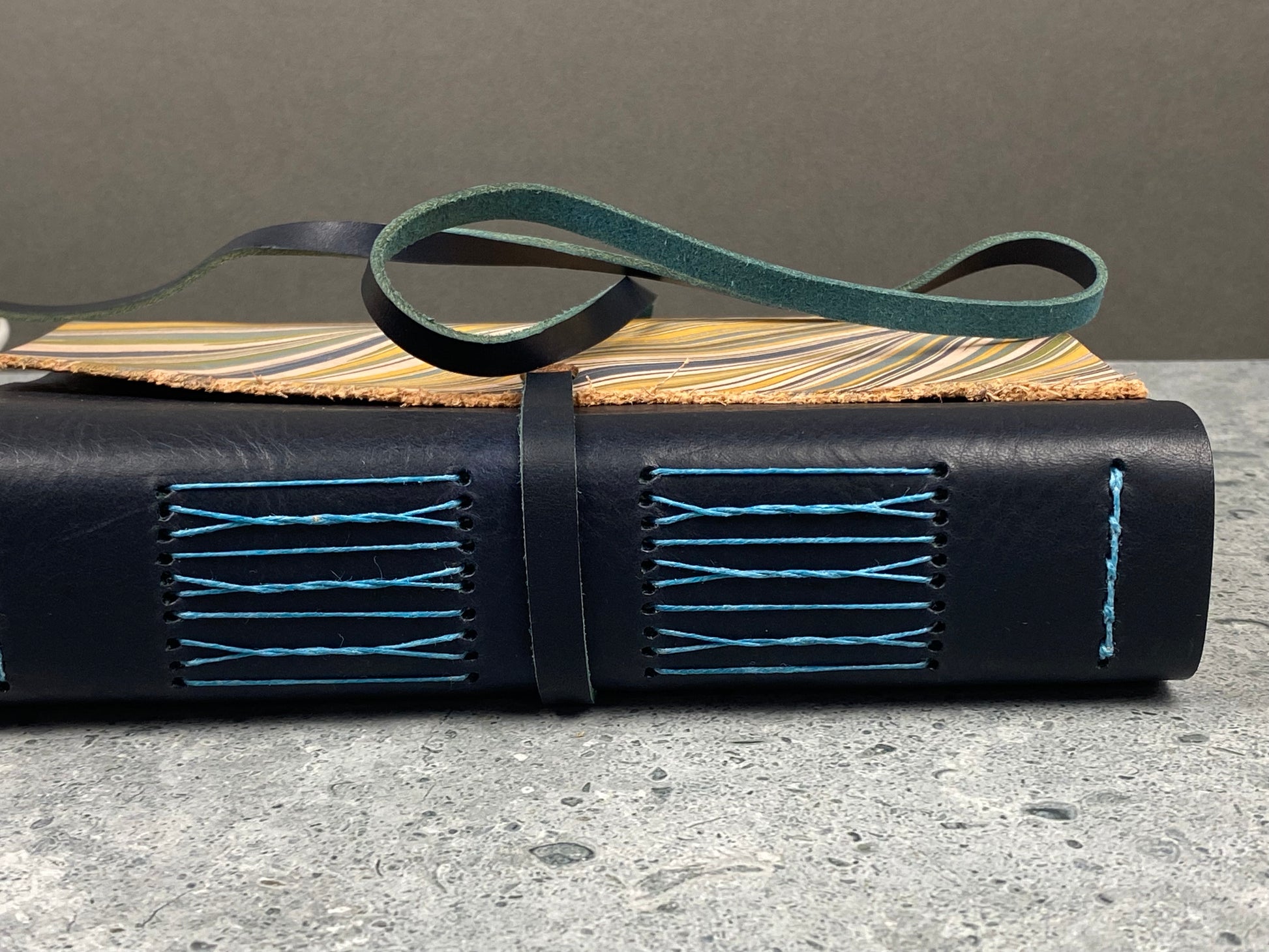 The exterior of the sketchbook is high quality leather with beautiful olive coloring. Kris hand makes these books and her attention to detail is obvious. Her prompt and courteous service, artistry and professionalism are all reasons Kris is a joy to work with.