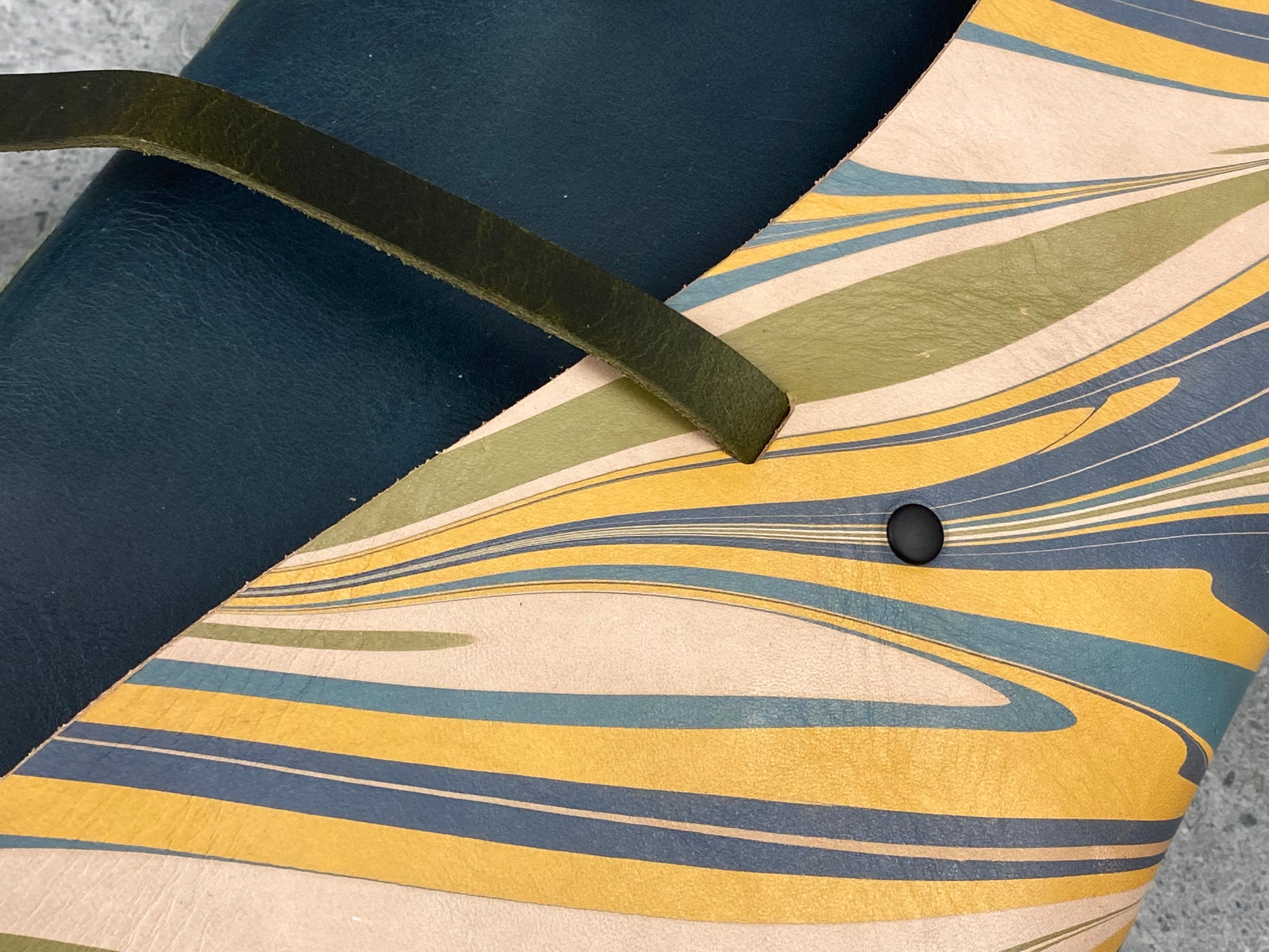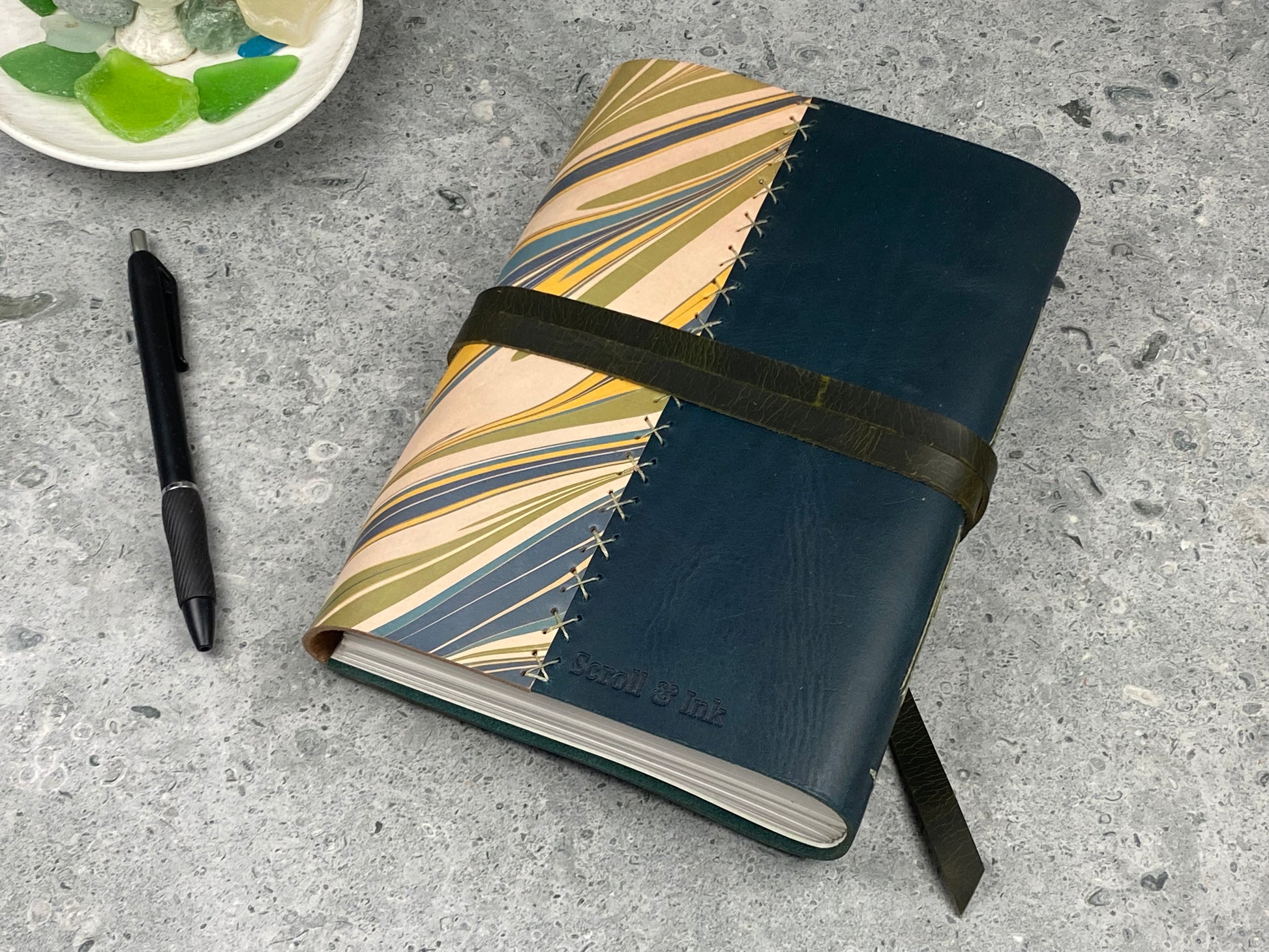 Part of my Gallery Collection. An absolute one-of-a-kind longstitch journal created with amazing walnut vegetable-tanned leather and my own hand-marbled leather. Both leathers are thick and rich, making this journal feel substantial in your hands.