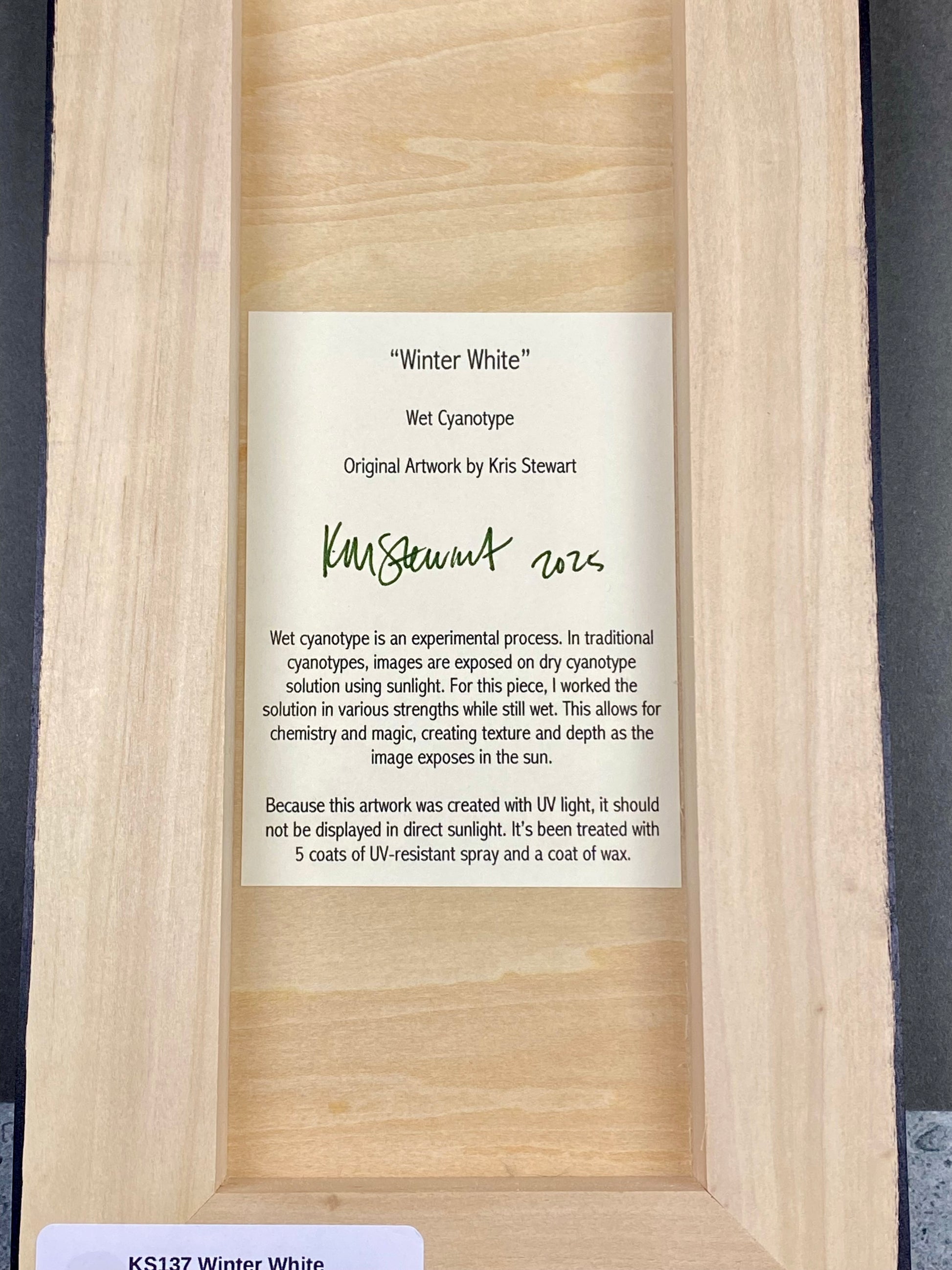 Winter White is a small original cyanotype created with a wet method and exposed to sunlight. This unusual way of making cyanotypes appeals to me because the images draw you in and make you look deeper.