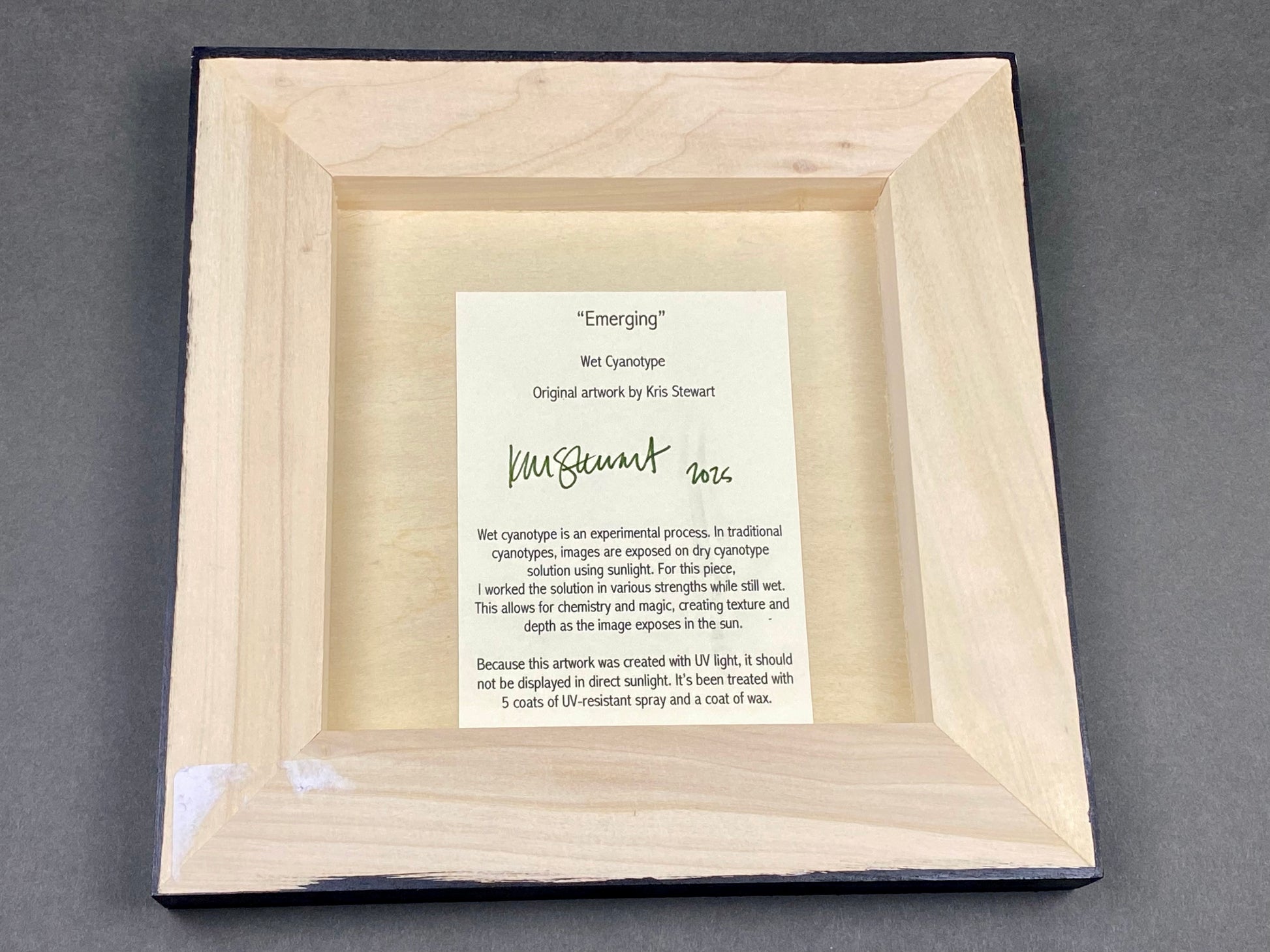 Emerging is a small original cyanotype created with a wet method and exposed to sunlight. This unusual way of making cyanotypes appeals to me because of the varied colors and implied textures I'm able to achieve. In this case, the gold is iridescent. These images really draw you in and make you look deeper.