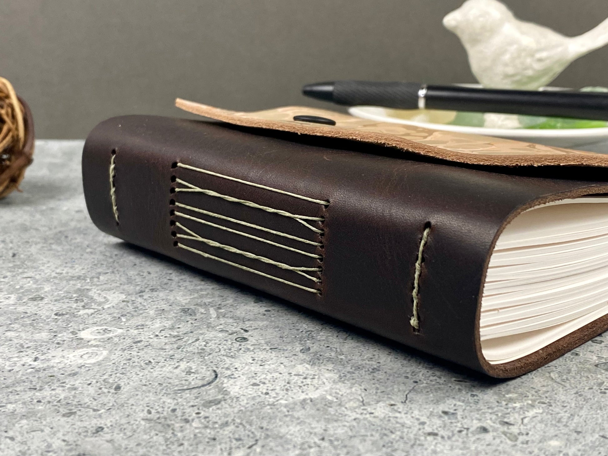 Prefer something smaller? This journal features all the detail of larger Scroll & Ink journals in a compact package! Luscious espresso veg-tan leather has been paired with a panel of my hand-marbled leather, making a handsome one-of-a-kind book. This journal closes with a brass snap (matte black finish).